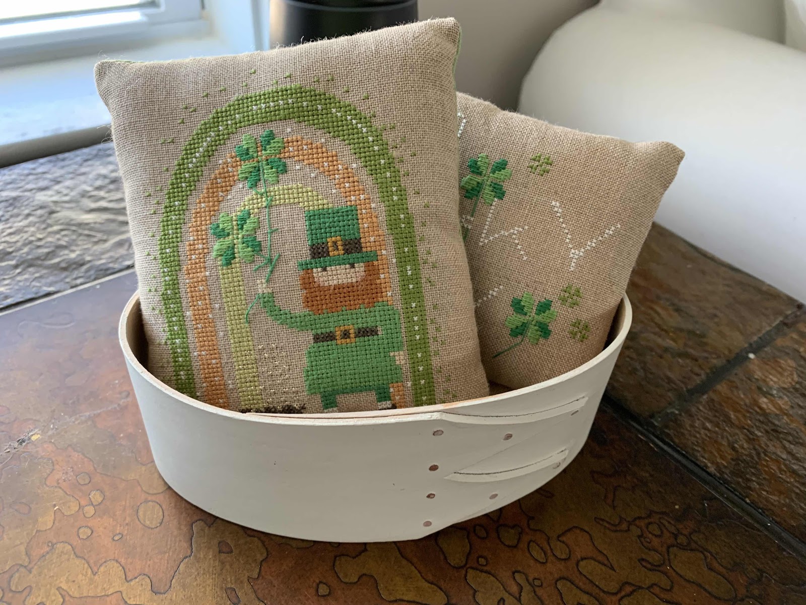 From Brick City Cross Stitch in Ocala, FL - Fabric: 40 ct. Heartland by Picture this Plus and 40 ct. Latte by Fiber on a Whim. Charts: Alice Clark 1844 by Cross Stitch Antiques, Eliza Stephenson 1827 by Lila’s Studio, Gathering Together by The Scarlett House and Joy & Good Cheer by Brenda Gervais.