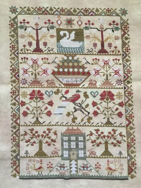 Good Morning Everyone! I am up in Michigan and have been stitching exclusively on Caroline Broomhead 1838 by Plum Street Antiques.